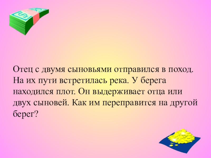 Отец с двумя сыновьями отправился в поход. На их пути встретилась река. У берега находился плот. Он