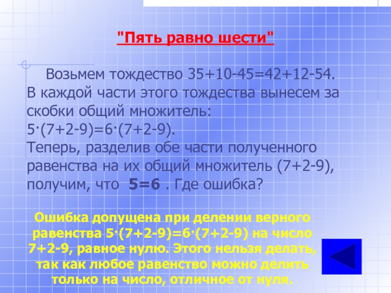Теперь, разделив обе части полученного равенства на их общий множитель (7+2-9), получим, что 5=6 . Где ошибка?