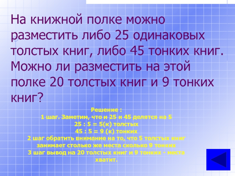 2 шаг обратить внимание на то, что 5 толстых книг занимает столько же места сколько 9 тонких