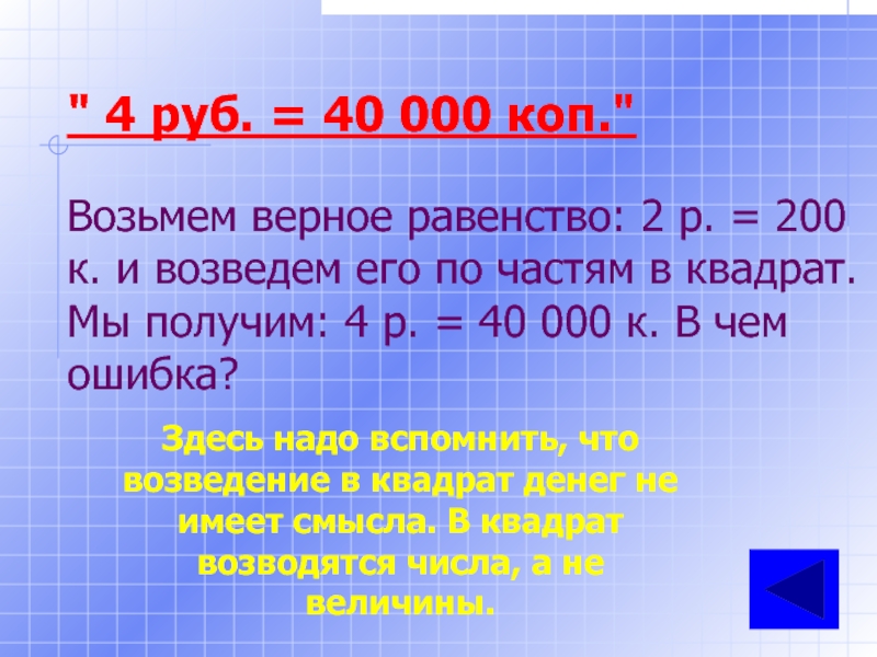 Здесь надо вспомнить, что возведение в квадрат денег не имеет смысла. В квадрат возводятся числа, а не величины.