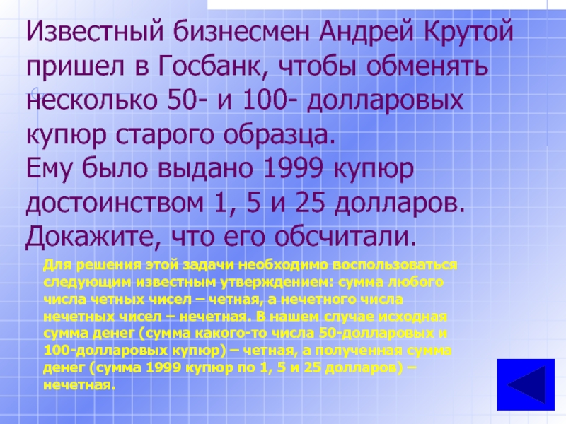 Для решения этой задачи необходимо воспользоваться следующим известным утверждением: сумма любого числа четных чисел – четная, а нечетного числа нечетных чисел – нечетная. В нашем случае исходная сумма денег (сумма какого-то числа 50-долларовых и 100-долларовых купюр) – четная, а полученная сумма денег (сумма 1999 купюр по 1, 5 и 25 долларов) – нечетная.