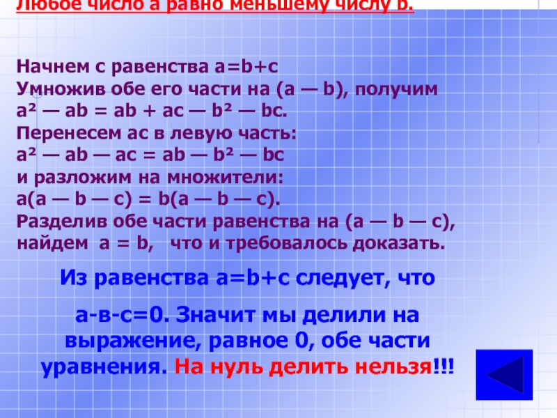 а-в-с=0. Значит мы делили на выражение, равное 0, обе части уравнения. На нуль делить нельзя!!!