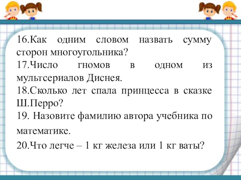 Слайд 616.Как одним словом назвать сумму сторон многоугольника?