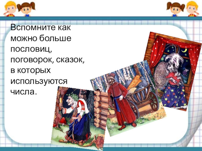 Слайд 14Вспомните как можно больше пословиц, поговорок, сказок, в которых используются числа.
