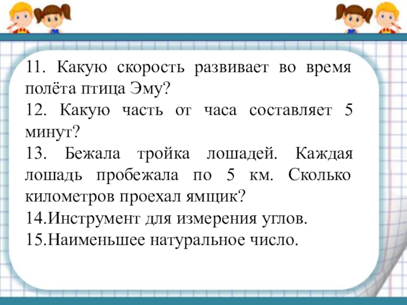 13. Бежала тройка лошадей. Каждая лошадь пробежала по 5 км. Сколько километров проехал ямщик?