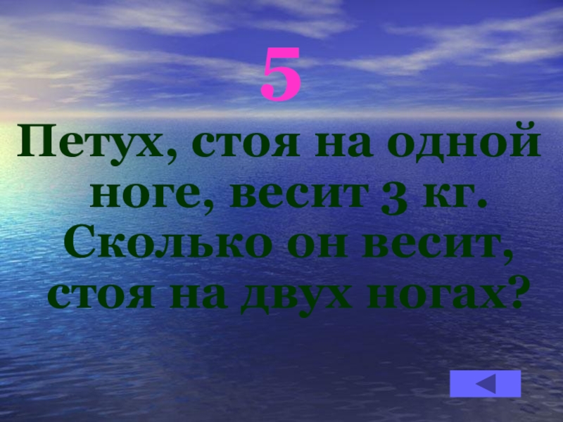 5Петух, стоя на одной ноге, весит 3 кг. Сколько он весит, стоя на двух ногах?