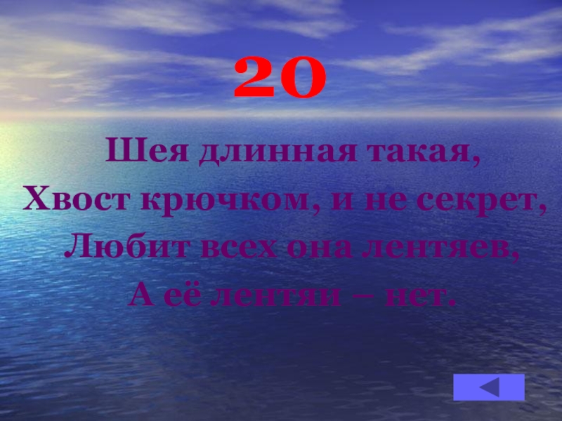 20Шея длинная такая,Хвост крючком, и не секрет,Любит всех она лентяев,А её лентяи – нет.