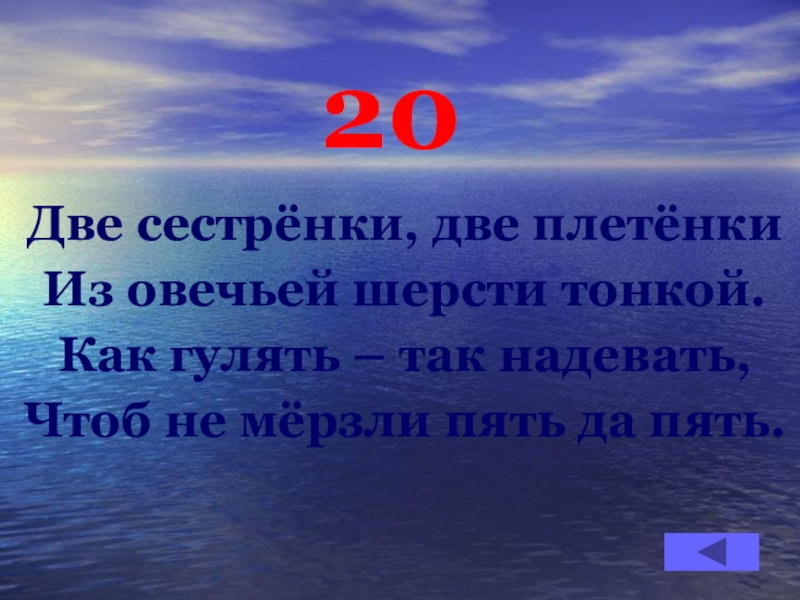 20Две сестрёнки, две плетёнкиИз овечьей шерсти тонкой.Как гулять – так надевать,Чтоб не мёрзли пять да пять.