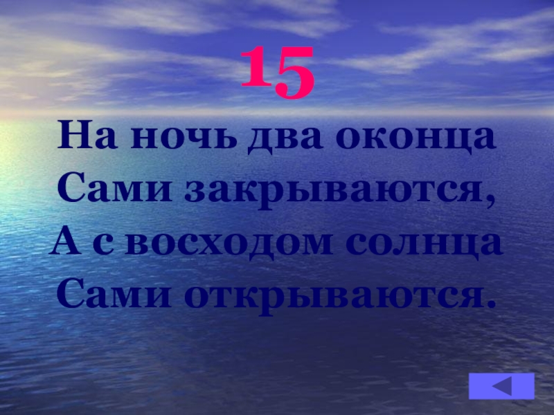 15На ночь два оконцаСами закрываются,А с восходом солнцаСами открываются.
