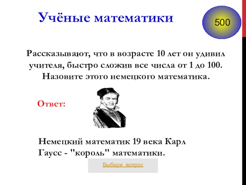 Немецкий математик 19 века Карл Гаусс - "король" математики.