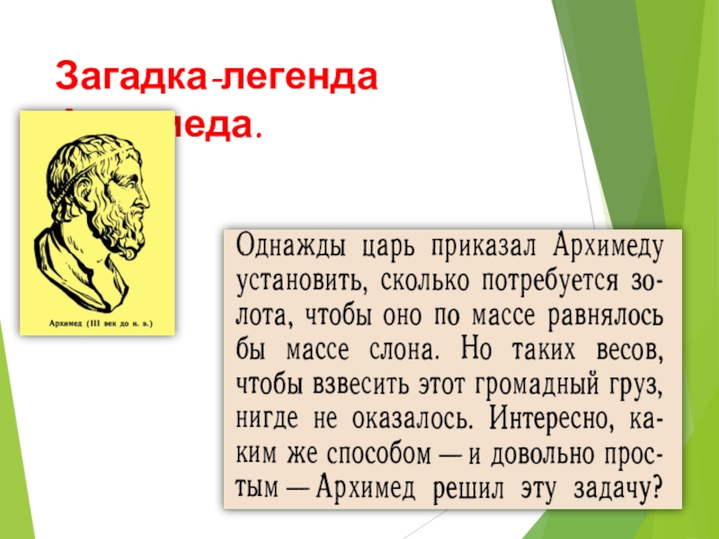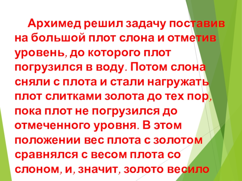 и отметив уровень, до которого плот погрузился в воду. Потом слона сняли с плота и стали нагружать плот слитками золота до тех пор, пока плот не погрузился до отмеченного уровня. В этом положении вес плота с золотом сравнялся с весом плота со слоном, и, значит, золото весило столько же, сколько слон.