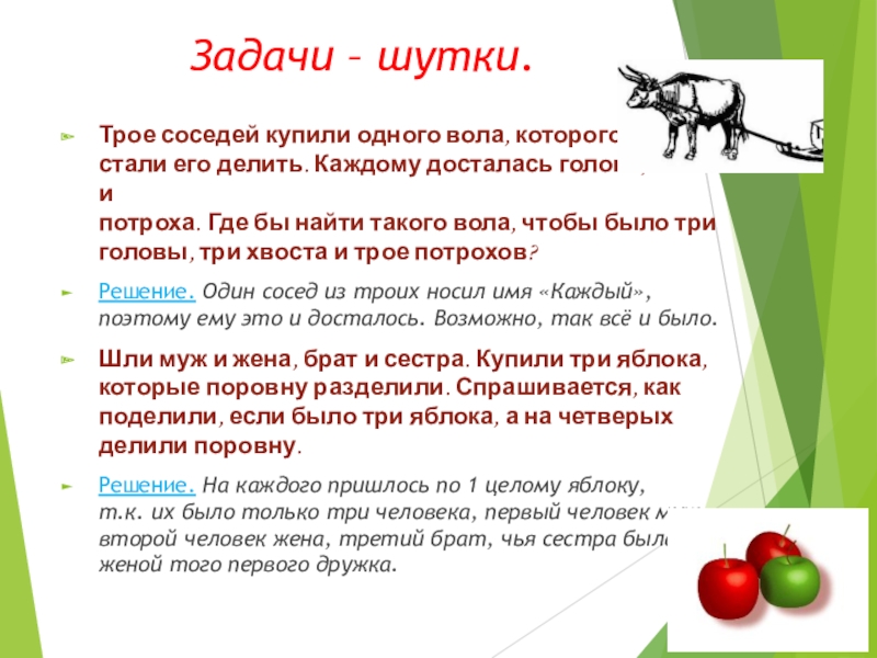 Шли муж и жена, брат и сестра. Купили три яблока,