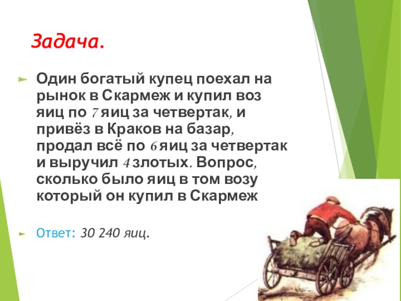 яиц по 7 яиц за четвертак, и привёз в Краков на базар, продал всё по 6 яиц за четвертак и выручил 4 злотых. Вопрос, сколько было яиц в том возу, который он купил в Скармеже.