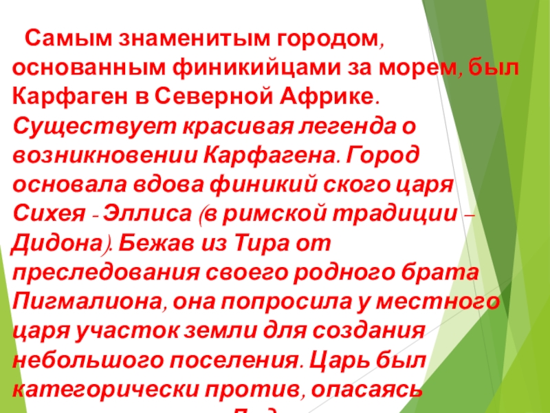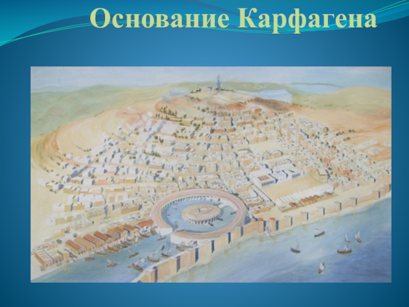 в Северной Африке. Существует красивая легенда о возникновении Карфагена. Город основала вдова финикий ского царя Сихея - Эллиса (в римской традиции – Дидона). Бежав из Тира от преследования своего родного брата Пигмалиона, она попросила у местного царя участок земли для создания небольшого поселения. Царь был категорически против, опасаясь коварных планов Дидоны и ее сторонников. Она стала умолять непреклонного хозяина земель выделить ей и её свите хотя бы столько земли, на сколько хватит шкуры одного быка.