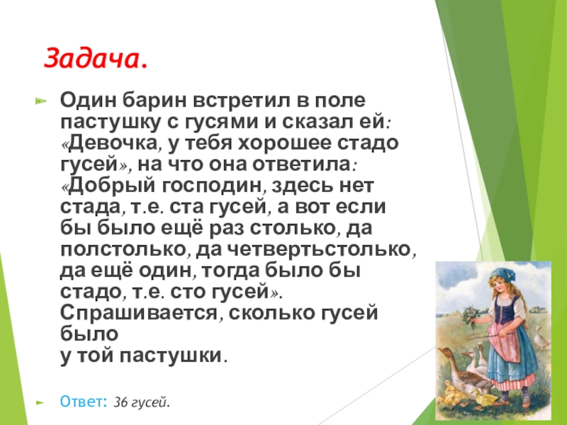 «Девочка, у тебя хорошее стадо гусей», на что она ответила: «Добрый господин, здесь нет стада, т.е. ста гусей, а вот если бы было ещё раз столько, да полстолько, да четвертьстолько,