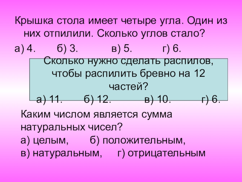 Крышка стола имеет четыре угла. Один из них отпилили. Сколько углов стало?