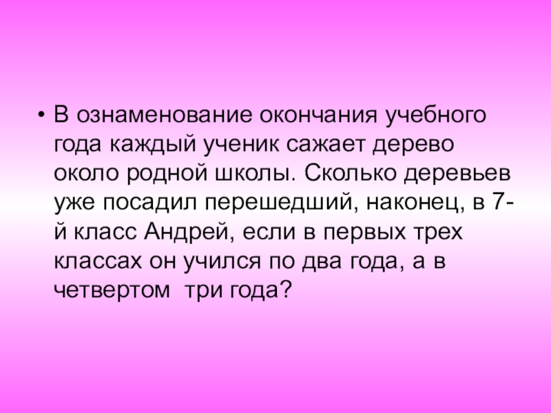 школы. Сколько деревьев уже посадил перешедший, наконец, в 7-й класс Андрей, если в первых трех классах он учился по два года, а в четвертом три года?