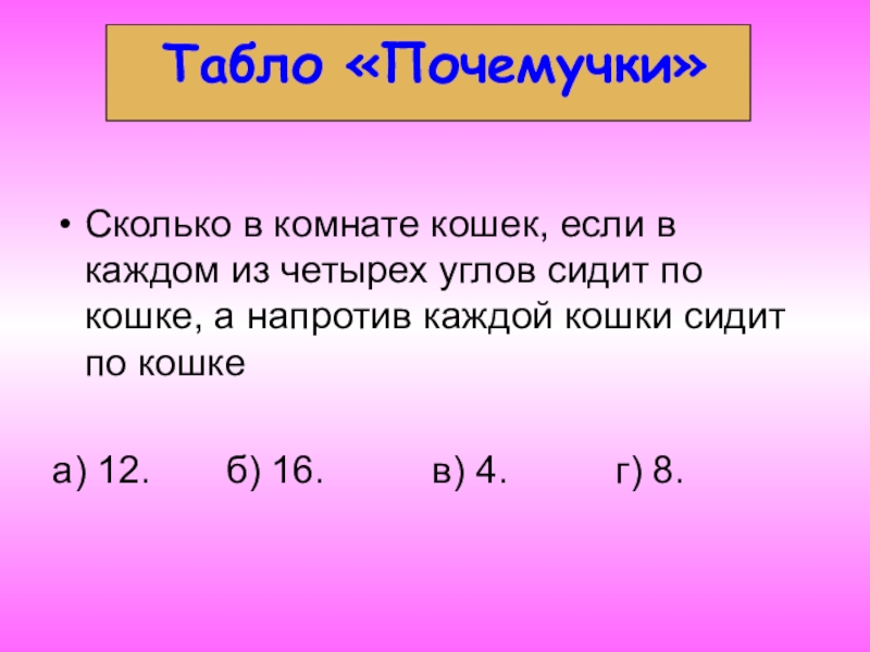 сидит по кошке, а напротив каждой кошки сидит по кошке