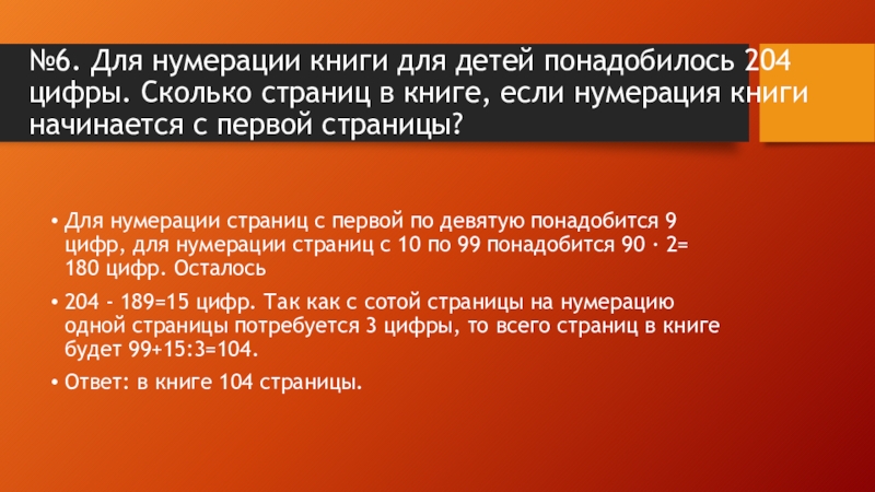 204 - 189=15 цифр. Так как с сотой страницы на нумерацию одной страницы потребуется 3 цифры, то всего страниц в книге будет 99+15:3=104.