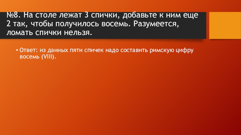 Ответ: из данных пяти спичек надо составить римскую цифру восемь (VIII).