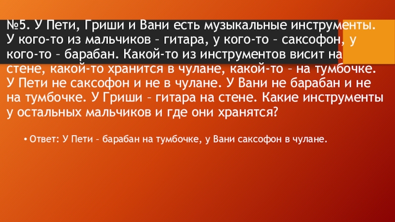 Ответ: У Пети – барабан на тумбочке, у Вани саксофон в чулане.