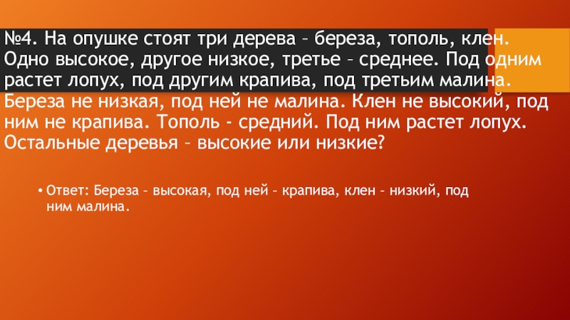 Ответ: Береза – высокая, под ней – крапива, клен – низкий, под ним малина.