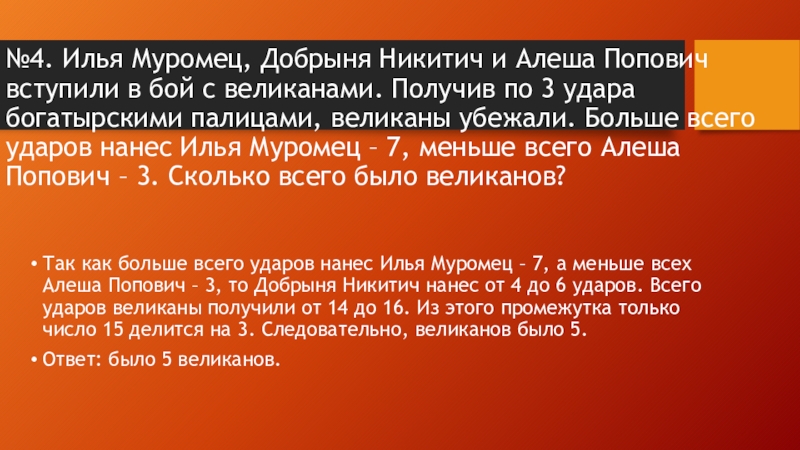 Так как больше всего ударов нанес Илья Муромец – 7, а меньше всех Алеша Попович – 3, то Добрыня Никитич нанес от 4 до 6 ударов. Всего ударов великаны получили от 14 до 16. Из этого промежутка только число 15 делится на 3. Следовательно, великанов было 5.