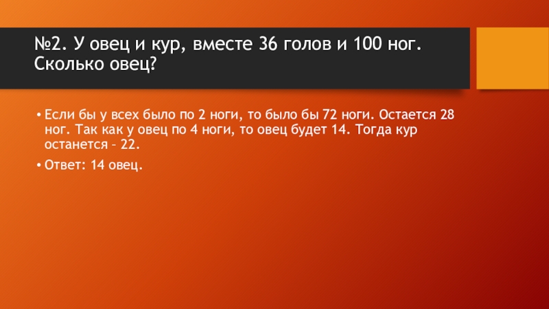 Если бы у всех было по 2 ноги, то было бы 72 ноги. Остается 28 ног. Так как у овец по 4 ноги, то овец будет 14. Тогда кур останется – 22.