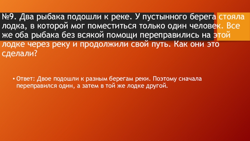 Ответ: Двое подошли к разным берегам реки. Поэтому сначала переправился один, а затем в той же лодке другой.