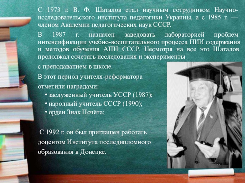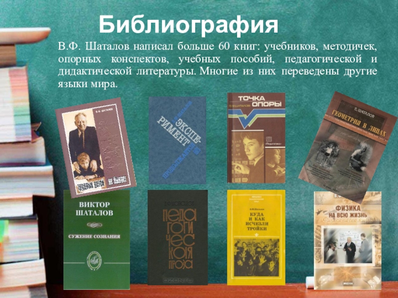 В.Ф. Шаталов написал больше 60 книг: учебников, методичек, опорных конспектов, учебных