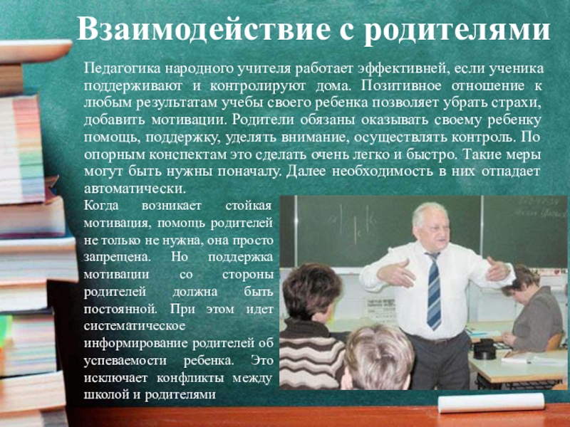 Когда возникает стойкая мотивация, помощь родителей не только не нужна, она просто запрещена. Но поддержка мотивации со стороны родителей должна быть постоянной. При этом идет систематическое информирование родителей об успеваемости ребенка. Это исключает конфликты между школой и родителями