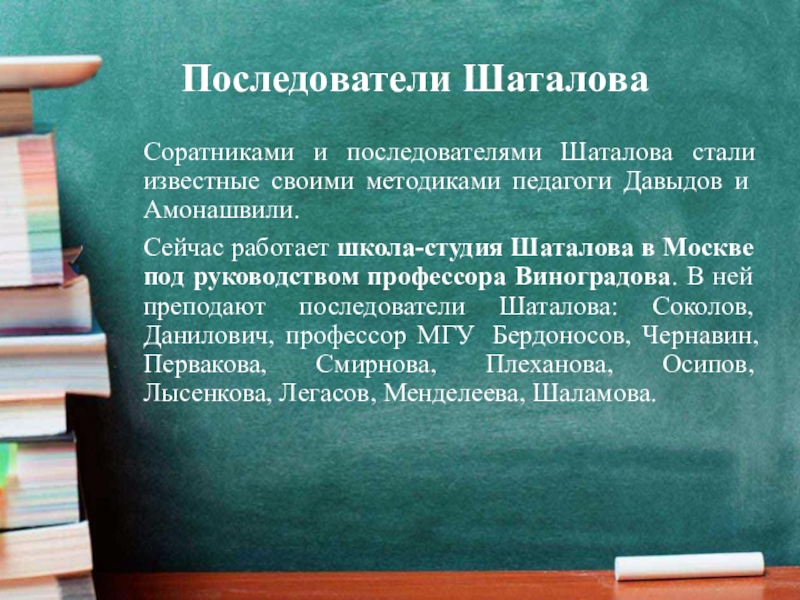 Соратниками и последователями Шаталова стали известные своими методиками педагоги Давыдов