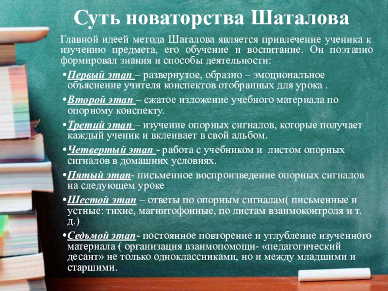 Главной идеей метода Шаталова является привлечение ученика к изучению