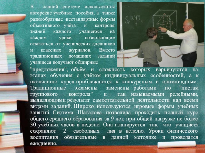 индивидуальных особенностей, а к окончанию курса приближаются к конкурсным и олимпиадным. Традиционные экзамены заменены работами по "листам группового контроля" и так называемыми релейными, выявляющими результат самостоятельной деятельности над всеми видами заданий. Широко используются игровые формы учебных занятий. Система Шаталова позволила проходить полный курс общего среднего образования за 9 лет, при общей нагрузке не более 30 учебных часов в неделю. Она планируется так, что учащиеся сохраняют 2 свободных дня в неделю. Уроки физического воспитания обязательные в данной методике и проводятся ежедневно.