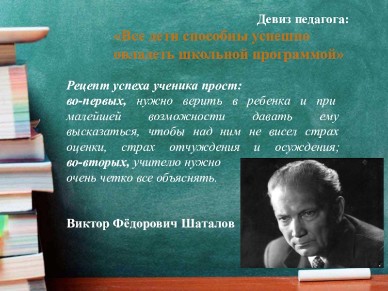 общеобразовательной школы оригинальную систему интенсивного обучения. Его методика принципиальный вклад в педагогическую науку и практику. Вся его система обучения построена по принципу уважения к личности школьника, гуманного отношения к нему. Он к каждому ученику подходит с оптимистической гипотезой, верит в его учебные способности, возможность усвоения любым школьником учебного материала на уровне «четверки» и «пятерки». Создавая доброжелательную обстановку на занятиях, Виктор Федорович вызывает у учащихся чувство уверенности в свои силы и успеха в учебной работе. Подчеркнем, что В.Ф. Шаталов на первое место в процессе обучения ставит воспитательную задачу, а также формирование у учащихся
