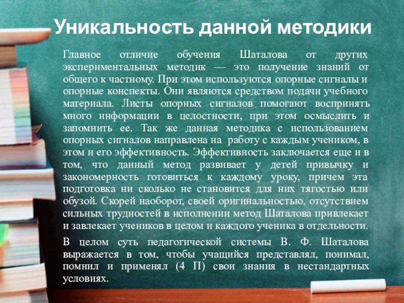 В целом суть педагогической системы В. Ф. Шаталова выражается в том, чтобы учащийся представлял, понимал, помнил и применял (4 П) свои знания в нестандартных условиях.