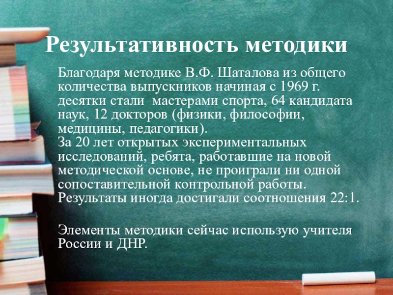Многие находки В.Ф.Шаталова используются не только учителями школ, но и педагогами вузов при обучении студентов.