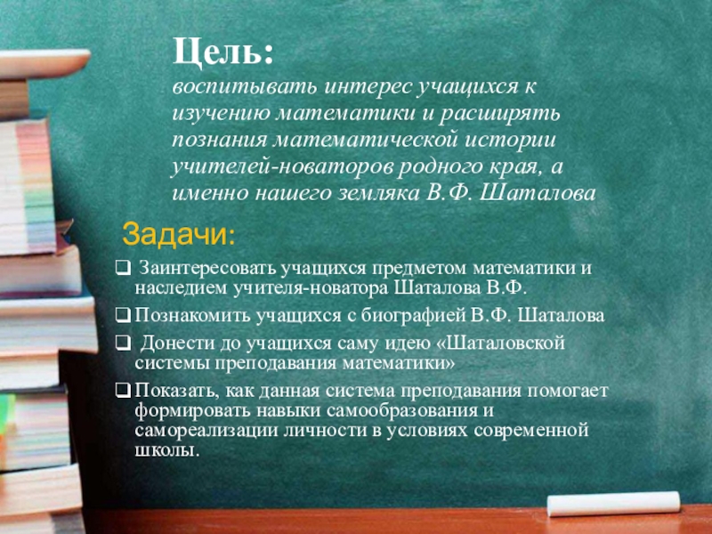 Заинтересовать учащихся предметом математики и наследием учителя-новатора Шаталова В.Ф.