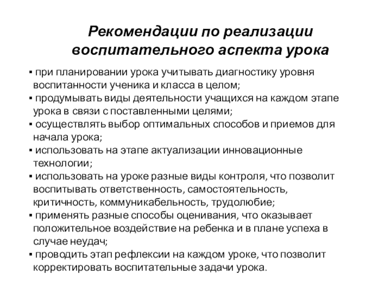 Слайд 9Рекомендации по реализации воспитательного аспекта урока