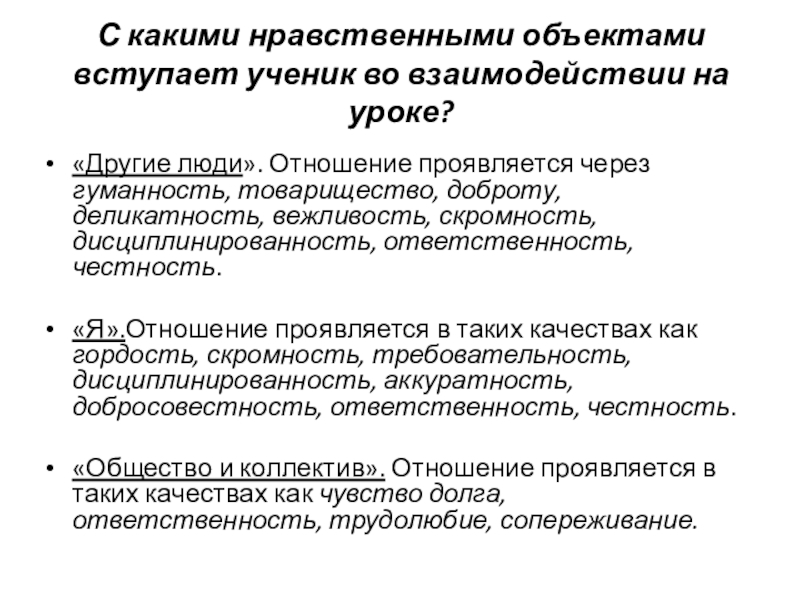 Слайд 8С какими нравственными объектами вступает ученик во взаимодействии на уроке?