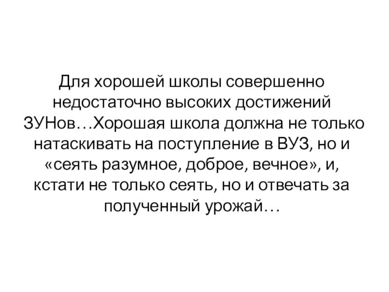Слайд 10Для хорошей школы совершенно недостаточно высоких достижений ЗУНов…Хорошая школа должна не