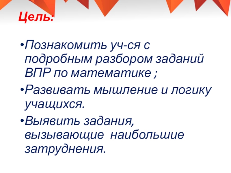 Цель:Познакомить уч-ся с подробным разбором заданий ВПР по математике ;Развивать мышление и логику учащихся.Выявить задания, вызывающие наибольшие