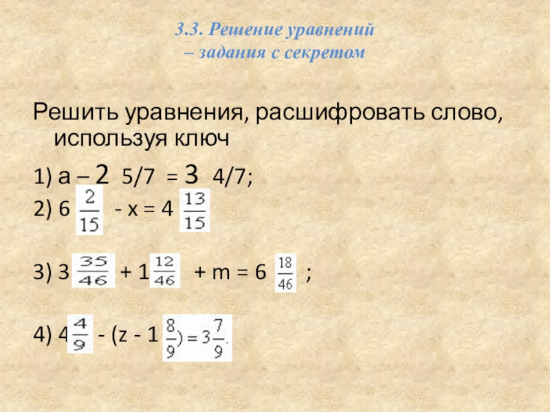 Решить уравнения, расшифровать слово, используя ключ