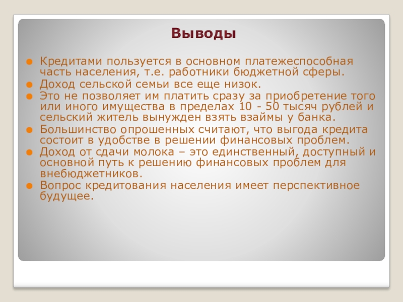 Кредитами пользуется в основном платежеспособная часть населения, т.е. работники бюджетной сферы.