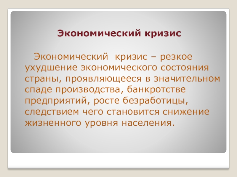 экономического состояния страны, проявляющееся в значительном спаде производства, банкротстве предприятий, росте безработицы, следствием чего становится снижение жизненного уровня населения.