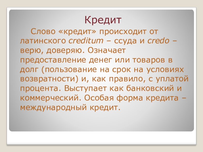 и credo – верю, доверяю. Означает предоставление денег или товаров в долг (пользование на срок на условиях возвратности) и, как правило, с уплатой процента. Выступает как банковский и коммерческий. Особая форма кредита – международный кредит.