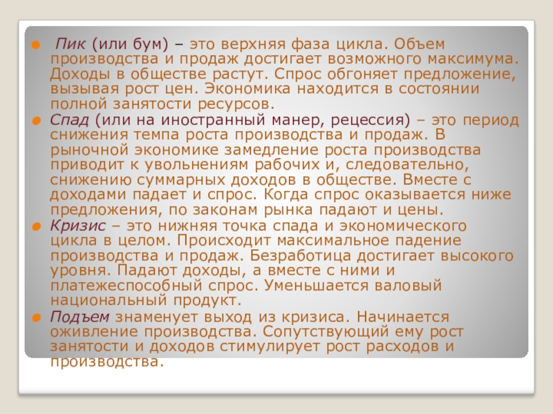 Слайд 11 Пик (или бум) – это верхняя фаза цикла. Объем производства
