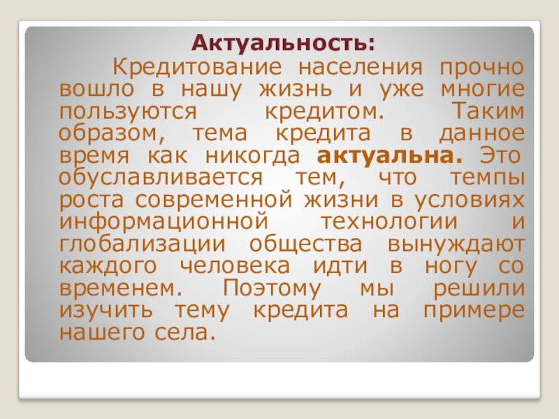 уже многие пользуются кредитом. Таким образом, тема кредита в данное время как никогда актуальна. Это обуславливается тем, что темпы роста современной жизни в условиях информационной технологии и глобализации общества вынуждают каждого человека идти в ногу со временем. Поэтому мы решили изучить тему кредита на примере нашего села.