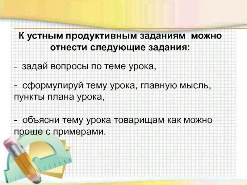Слайд 7К устным продуктивным заданиям можно отнести следующие задания: