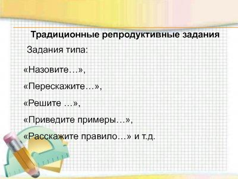 – это задания, результат выполнения которых (ответ на вопрос) содержится в учебнике в готовом, легко воспроизводимом виде.